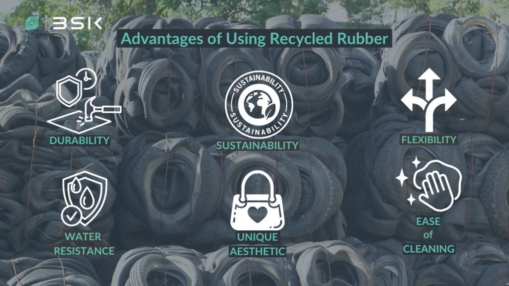 Using recycled rubber from tires for bag production contributes to environmental sustainability and offers unique benefits to consumers. Here’s a look at the key advantages and specific features that make recycled rubber particularly suitable for certain bags.
